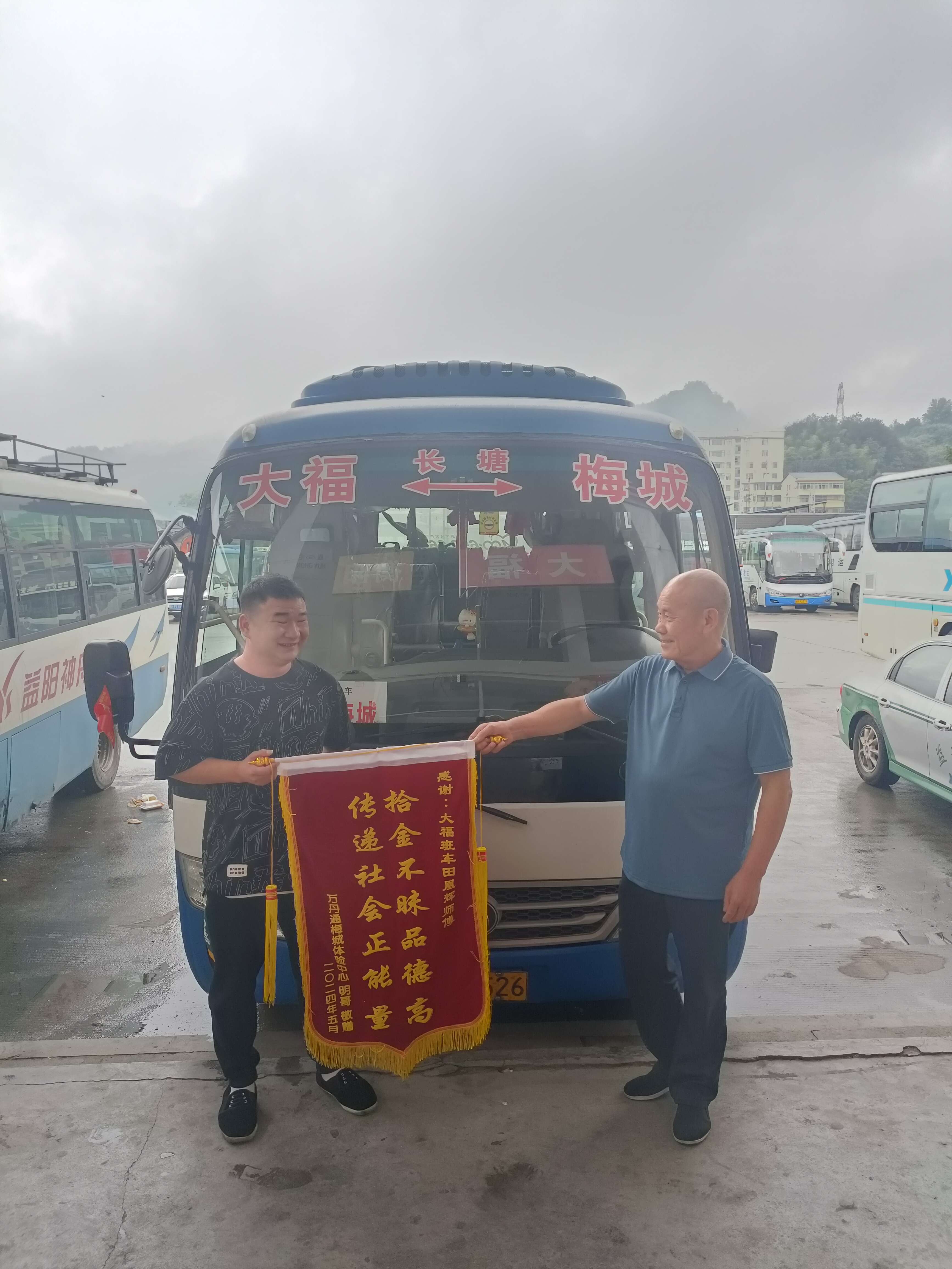 6月1日9:00,一名男乘客手持錦旗來到梅城客運分公司停車坪尋找到湘HA6526車后,熱情地與該車駕駛員田凰輝握手,不停地說著“謝謝!謝謝!”。