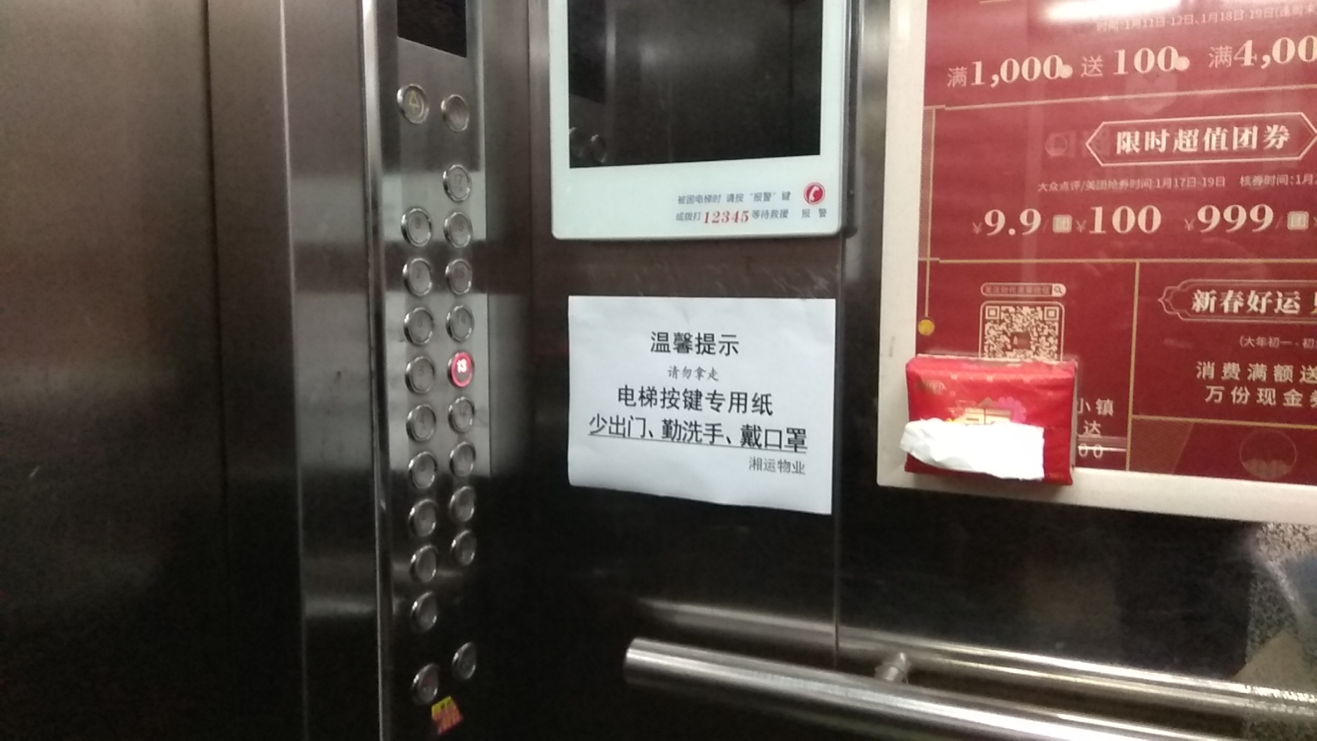 2月1日,在益陽(yáng)市桃花里小區(qū)的電梯里,出現(xiàn)了一張醒目的“溫馨提示”A4紙,旁邊安放了一盒抽紙巾。這是湘運(yùn)物業(yè)服務(wù)管理公司細(xì)心防控疫情的有力措施。根據(jù)電梯空間小、封閉嚴(yán),一旦有病毒極易被感染的情況,公司經(jīng)理袁笑當(dāng)天一早就安排值班人員采購(gòu)、準(zhǔn)備好了相關(guān)物資,并第一時(shí)間落實(shí)到位。截止當(dāng)天12:00,桃花里小區(qū)21臺(tái)電梯里都有了如圖所示的便民抽紙。